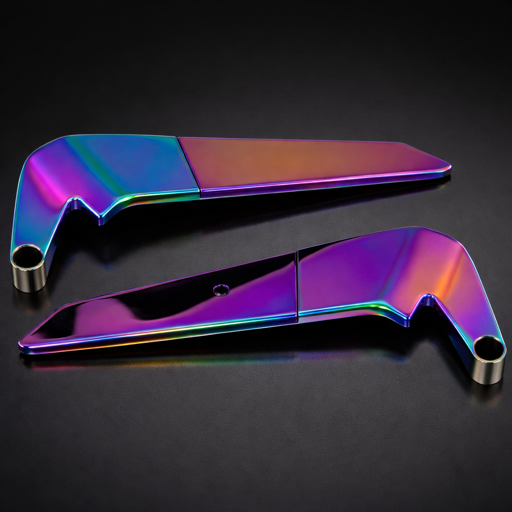 No necesitas cambiar de moto para que se vea diferente. Estos espejos tipo alerón con acabado tornasol transforman el look desde el primer momento: diseño deportivo, cuerpo metálico y un acabado que reacciona con la luz, haciendo que tu moto destaque sin esfuerzo.