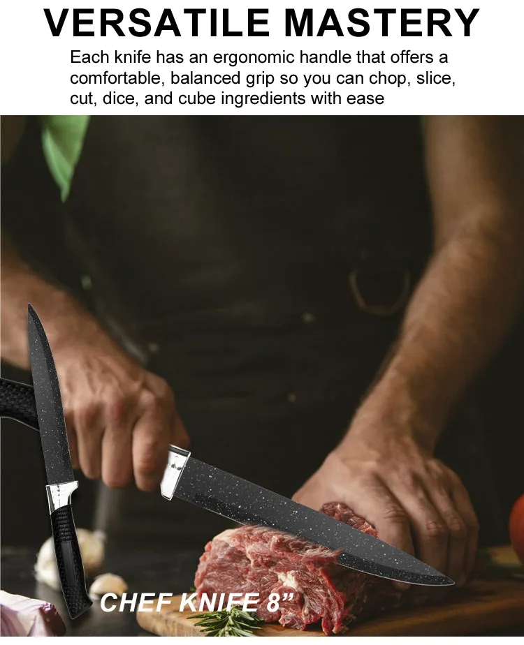 El diseño de sus mangos ergonómicos asegura un agarre firme y cómodo, evitando deslizamientos. Su recubrimiento especial no solo mejora la apariencia, sino que también facilita la limpieza y conservación de los cuchillos.